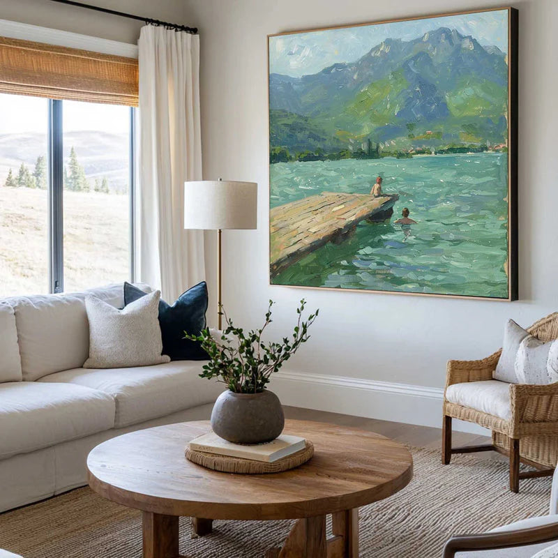 This nostalgic piece captures the perfect memory of childhood! The soft, blue water, the sunlit dock, and the friends in the distance bring you back to a time when the world felt simple, and your heart felt light. The unique painting style makes this piece suited for any home interior! Pair it with 'Summer in the Alps' to emphasis the theme.